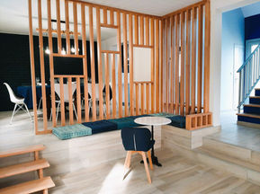 La maison se compose au RDC d'une cuisine équipée (plaques induction, four, four micro-ondes, réfrigérateur, congélateur, lave-vaisselle et un lave-linge combiné sèche linge), d'une salle à manger, d'un salon et d'un bureau. Ce dernier comprend une banquette 80 X 200 qui se transforme en lit 160 X 200.