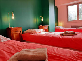 A l’étage vous trouverez une chambre lit queen size avec sa salle d'eau, d'une chambre dortoir avec 3 lits 90 X 200 (2 lits peuvent être jumelés pour former un king size) et d'une salle de bains. Il y a un WC par niveau. Les lits sont faits à votre arrivée. Les serviettes de bains sont disponibles avec un supplément.